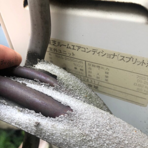 G.A.様宅 エアコンの冷えが悪いとの案件 古いタイプの機械。 アース無しの状態が確認が出来、アース棒施行。 安全性確保 冷えを悪くする箇所検索。保温剤の欠損確認。 補修施工